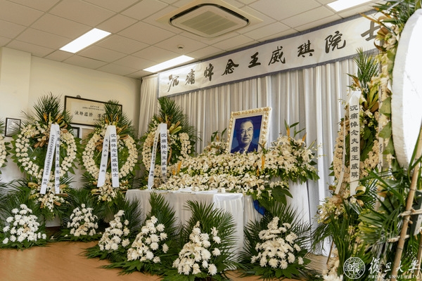 灵堂正中挂着王威琪院士的遗像,两侧挽联上写着“躬耕一生寒暑波联国际声振海外 执教杏坛甲子泽被后学风传千秋”。院士已去,安卧鲜花丛中。