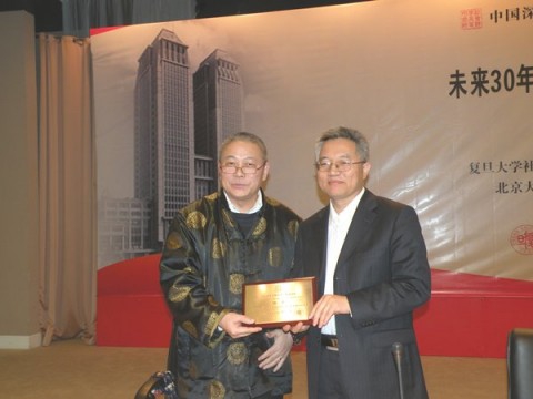 在正式演讲开始之前,邓正来教授代表高研院向张维迎教授颁发了“复旦大学社会科学高等研究院学术委员会创始委员”的聘书。接着,张维迎教授为大家带来了题为“未来30年中国经济增长与体制改革”的讲演。