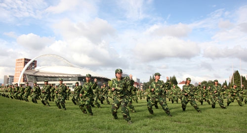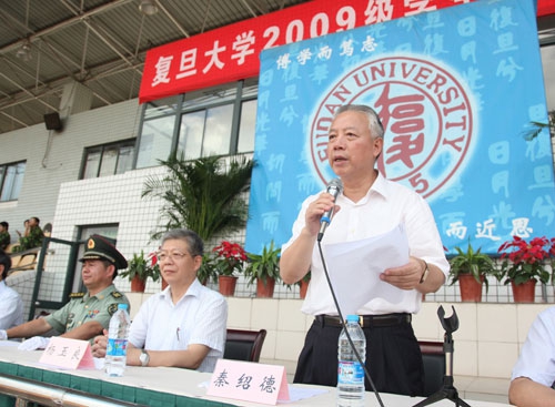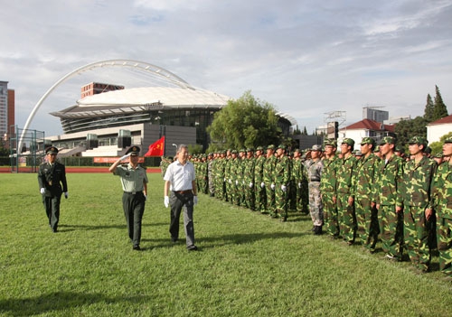 9月2日下午,2009级学生军训汇报大会在南区体育场举行,校党委书记秦绍德、校长杨玉良、副书记刘建中、副书记王小林、常务副校长张一华、副校长蔡达峰、73031部队师长韩志凯及校内有关部处负责同志在主席台就坐。大会由军训团政委、校党委副书记陈立民主持。