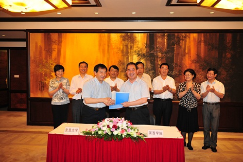 签约仪式上,我校常务副校长陈晓漫、河西学院校长刘仁义代表双方在协议书上签字。根据协议,我校将依托生物、环境科学等优势学科的科研实力和创新团队,在新能源开发与利用、环境工程、生物科技等领域与河西学院开展广泛合作,扎实有效地推进双方在人才培养、科学研究、社会服务等方面的合作与发展。