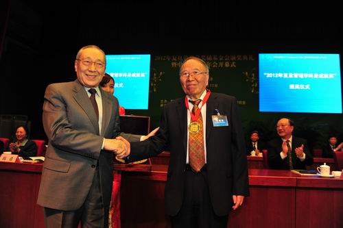 北京航空航天大学黄海军教授和中国科技大学梁樑教授,以其多年来在我国管理科学与工程领域的研究中所做出的卓越成就夺得了今年的“复旦管理学杰出贡献”奖。他们将分获每人50万元人民币的奖金。为了表彰对中国管理学学科建设、人才培养等方面做出开创性、奠基性贡献的老一辈工作者,今年,基金会专门增设了“复旦管理学终身成就奖”。被誉为“中国质量管理之父”的中科院数学与系统科学研究院研究员、中国工程院院士刘源张成为了该奖项的首位获得者,并被授予专门制作的金质奖盘。