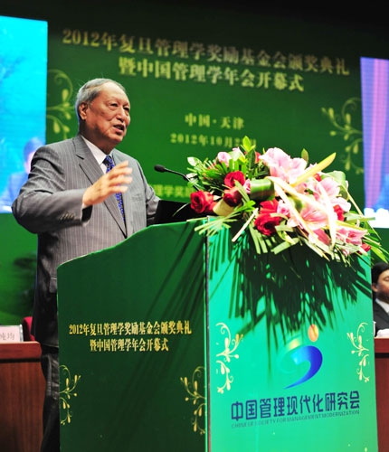 复旦管理学奖励基金会理事长、第十届全国政协副主席徐匡迪,复旦管理学奖励基金会副理事长、中国管理现代化研究会名誉理事长、第九、十届全国人大常委会副委员长成思危在当天的典礼上讲话,并为“复旦管理学杰出贡献奖”获得者颁奖。