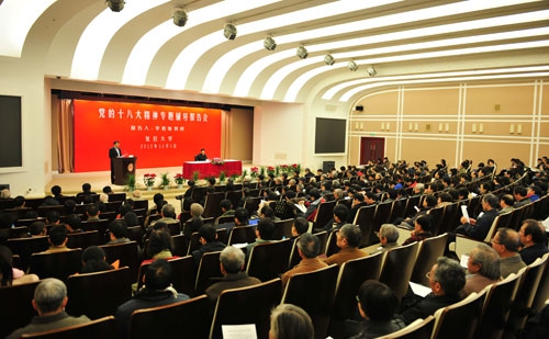 校党委书记朱之文主持会议。校长杨玉良等校党政领导,校党委委员、纪委委员,各单位、各部门负责人,学校党的十八大精神宣讲团成员,中青年骨干教师代表,机关干部代表,老同志代表等400余人聆听了报告。
