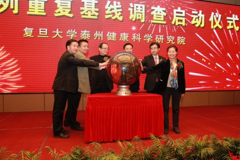 庆典仪式后,由徐郭平市长、金力副校长等共同启动“泰州队列重复基线调查”,为泰州人群健康跟踪调查工作揭开新的篇章。研究院将在泰州地区再次发动已建成的社区服务网络体系的工作人员30余人,再次跟踪调查队列人群并收集其血液、尿液等样本。本次调查项目的核心是将前后收集的生物样本提取DNA进行对比研究,探索疾病病因。泰州队列重复基线调查项目的启动,将进一步积累公共卫生基础数据,为生物医学和转化医学研究提供丰富的资源库、信息库和共享平台;同时对中国医药城的建设发展必将起到重要的推动和促进作用,为全中国人民的民生和中华民族的伟大振兴作出贡献。