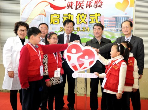 燕爽,桂永浩,邬惊雷,黄国英、徐虹与4名儿童观察团成员一起为“关注患儿就医体验”三年行动计划项目亮灯;萧思健、夏景林为“患儿体验部”揭牌;3月24日当天,复旦大学附属儿科医院首批4名上海少年日报社推荐产生的儿童观察员穿上了医院特制的蓝色隔离服走进门诊部,体验医护人员工作,医护人员也主动要求他们以孩子独特的“视角”对医院各项工作和环境“吹毛求疵”。4名观察员毫不吝啬自己的眼光,对医院的各个角落进行“评头论足,说三道四”,其中有一位对在现场的医务人员说,我每次来这里看病,你们门诊大厅的宣传视频的内容都是一样的,可以换换吗?医院正是希望通过“倾听”,了解孩子的感受、建议甚至督促,主动转变、完善,提高服务质量,促进医患和谐。