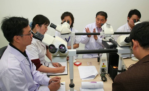 肿瘤医院援疆病理专家在多头显微镜前对当地病理医生进行业务指导