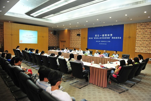 研究生院副院长陈玉刚主持座谈会,党委研究生工作部部长陈殷华汇报第五届“研究生心目中的好导师”评选过程和入选导师情况。“研究生心目中的好导师”评选活动由研究生团工委、研究生会在研究生院、党委研工部的指导下开展,两年一届,每届评出10位“好导师”,从2004年起已经连续举办5届。第五届评选活动从2012年11月启动,经过院系研究生推荐、全校宣传展示、网络投票等环节,于2013年1月下旬结束。中国语言文学系朱立元、新闻学院童兵、国际关系与公共事务学院陈明明、法学院郭建、生命科学学院马红、先进材料实验室郑耿峰、基础医学院程训佳、中山医院葛均波、华山医院张文宏、第五人民医院顾勇等10位导师获得“研究生心目中的好导师”称号,26位导师获提名奖。