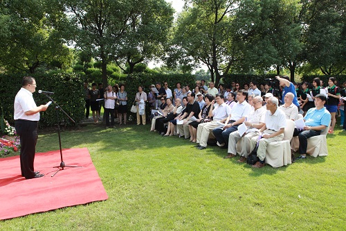 苍松翠柏之间,参加揭幕仪式的全体代表肃立在费巩烈士像前,深切缅怀他学植深厚、桃李天下的师者风范和反对专制、追求民主的浩然正气。复旦大学党委副书记刘建中在致辞中表示,费巩不仅是复旦的同龄人,更是复旦校友的杰出代表,在他的身上集中体现了“团结、服务、牺牲”的复旦精神品质和“学术独立、思想自由”的学术理念,复旦为拥有费巩这样的校友感到无比的自豪和光荣。各位代表也纷纷表达了继承和发扬先贤精神,用实际行动为实现伟大的中国梦而努力奋斗的决心,并献上花环和鲜花寄托对烈士的缅怀与追思。
