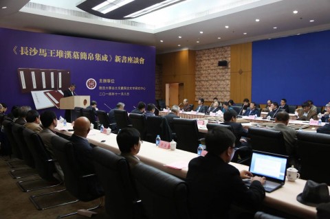 2014年11月8日上午,为庆祝《长沙马王堆汉墓简帛集成》的隆重出版,我校出土文献与古文字研究中心在本校逸夫科技楼举行了新书出版座谈会。各相关单位领导以及学界嘉宾、《集成》研究团队50余人出席了会议。座谈会由出土文献与古文字研究中心刘钊教授主持,上海社科联主席秦绍德先生、上海市委宣传部副部长燕爽先生、上海新闻出版局局长徐炯先生、中国出版集团副总裁李岩先生、吉林大学副校长兼中国古文字研究会会长吴振武先生、复旦大学副校长林尚立先生、中华书局总经理徐俊先生、湖南省博物馆党委副书记游振群女士分别致辞。清华大学出土文献研究与保护中心赵平安教授宣读了李学勤教授的贺信。本书主编裘锡圭教授代表研究团队最后发言。与会嘉宾还就《集成》的学术价值、社会影响等进行了热烈讨论。