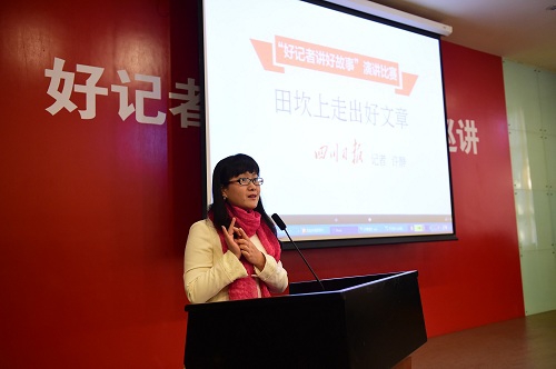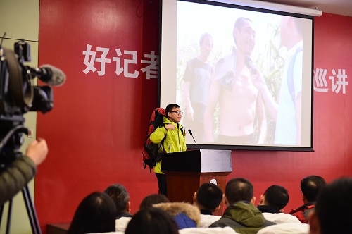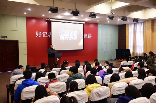 报告会由新闻学院党委书记周桂发主持,现场场面热烈,座无虚席。为“心目影院”盲人朋友读奥运的北京电视台新闻节目中心《特别关注》栏目主持人曹一楠,以反映农民呼声的《丰收稻谷堆成山 卖与不卖好着急》获第24届中国新闻奖的一等奖的四川日报经济新闻部记者许静,揭露富士康非法雇佣童工黑幕的大龄单身记者“特工”中央人民广播电台特别报道部吴喆华,多年来与好人郭明义共同用微博传递正能量的东北新闻网新闻部的李理,在攀登南极冰盖最高点报道路上险些丧命冰缝的中国海洋报社记者高悦,深入矿区周边私挖小煤窑揭露真相的基层记者长春日报社时政新闻部的孔非,奔走在舟曲特大洪泥石流前线报道抗灾的甘肃广电总台广播新闻中心采访部主任史昆,攀登珠峰、三进墨脱、跟随藏区乡村医生翻越5000多米大雪山巡诊,情系高原的藏家“媳妇儿”中央电视台新闻中心西藏记者站站长陈琴,冒着战火炮弹,在埃及、利比亚、叙利亚等国外战场中驻守,决心向世界揭示中东战争的真相的人民日报社国际部西亚非洲编辑室记者焦翔,在浙江丽水特大洪灾中为售粮户“消化”掉28万公斤大米的浙江报社记者俞佳友,他们讲述的每一个故事,都深深打动了现场的师生们,全场不时爆发出雷鸣般的掌声,不少同学被他们的经历所感动,许多人情不自禁地潸然泪下。
