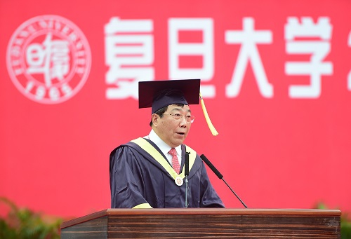 在热烈的掌声中,许宁生校长代表学校祝贺和祝福全体毕业生以及他们的家长和亲友。他希望全体毕业生在未来的人生道路上常怀感恩之心,真诚感谢他人的关心帮助、社会各方面的支持,以同样的热忱和真挚回馈他人、回馈社会;注重修德,知行合一、身体力行,不断完善提升自身价值观;终身学习,无论将来从事什么工作,都要发扬复旦的学术精神,勤奋学习、深入研究,在各自岗位上追求卓越、努力创新、有所创造;追求梦想,珍惜并发扬光大创新精神,为祖国繁荣昌盛和人类文明进步作出贡献。