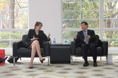 会见后,Christina Paxson校长做客“复旦通识大讲堂”,作了题为《大学:通向知识与人类未来之路》的演讲。Christina Paxson教授介绍了曾在布朗大学举行的“中国年”活动,并从“知识界的传统探索”,“综合性通识教育和参与式大学”,“与世界及其领导阶层的道德联系”,“人类的进步与知识的交流、传承和发现”等角度分享了治学、治校的感悟。