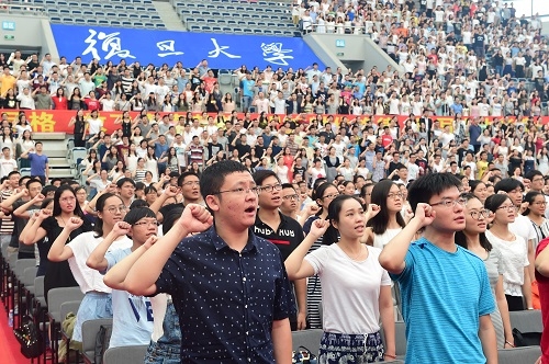 在主席台前排就座的校领导和老师亲切地为新生代表佩戴上校徽。这一刻起,他们也有了一个共同的名字“复旦人”。全场新生在研究生会主席唐荣堂的带领下庄严宣誓:“胸怀远大理想,关注人类命运,忠于祖国,热爱人民,探求真知,遵纪守法,文明诚信,博学笃志,切问近思,追求卓越,恪守学术道德,弘扬复旦精神,为学校争光添彩,为国家贡献力量!”