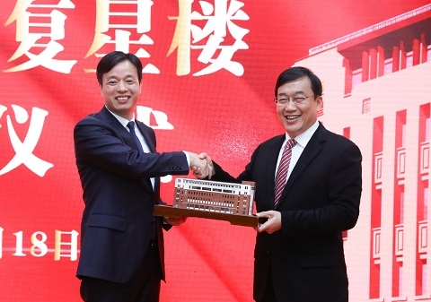 焦扬、许宁生、许征、张志勇、汪群斌、陈启宇、李海峰共同为“复星楼”揭牌。许宁生代表学校向复星赠送了纪念品——比例为1:200的3D打印版“复星楼”模型。随后双方就进一步加深和推动双方在医疗创新、医学研究等多领域合作深入交流。