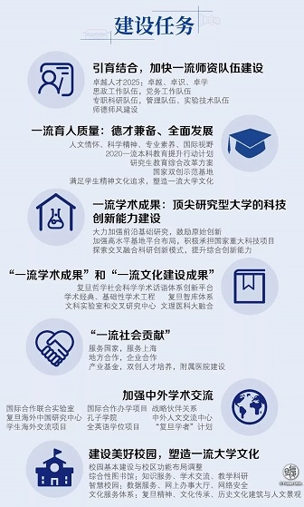 2017年12月28日,《复旦大学一流大学建设总体方案》(以下简称《方案》)正式发布。作为一所享有盛誉的综合性研究型大学,我们认识到:要实现中华民族伟大复兴的强国梦,高等教育必须率先向世界一流水平靠拢。复旦大学要在中国实现强国梦的道路上率先迈入“世界一流”,乃至跻身“世界顶尖”。