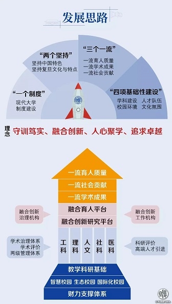 学校将以“一流育人质量、一流学术成果和一流社会贡献”为核心目标,重点建设27个一流学科,带动一级学科重点发展、融合发展和特色发展;注重学科融合创新和前沿发展,不断优化布局,形成五大学科门类整体发展新格局;以学科建设为龙头,带动一流大学建设。学校通过设置重点建设项目,从学校层面及各学科进行内涵建设,以质量和效益为标杆,发挥校院两级和师生积极性,确保一流大学和一流学科建设落到实处。
