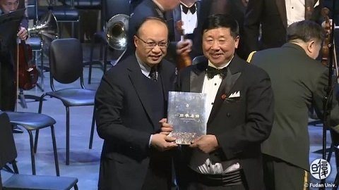满天星业余交响乐团团长叶小文向复旦大学校长助理陈志敏赠送《一路歌与诗》