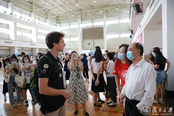 张人禾与前来报到的研究生新生交谈。来自意大利的留学生罗马克同学用非常流利的中文向张人禾介绍自己是国务学院国际关系专业的博士生,表示很开心能来到复旦学习。张人禾对他即将开始的异国生活表达了殷殷关切,并勉励他在复旦学有所成。