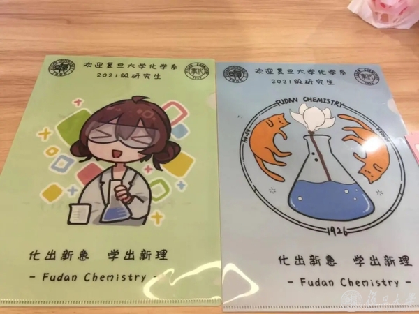 化学系为新生制作了原创文创文件夹,在校学生还为2021级新生绘制了化学系专属表情包。