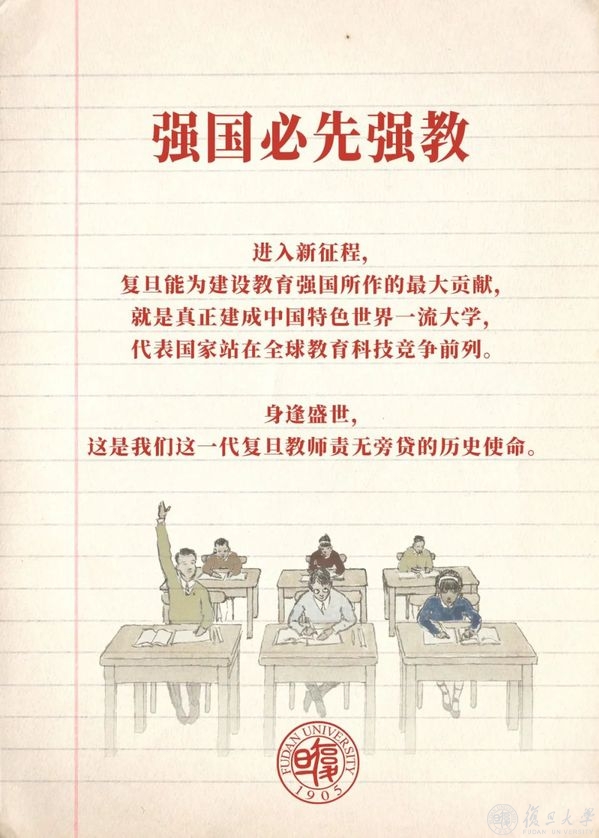 大屏幕上,建设“第一个复旦”的总动员令,以及学校对标建设社会主义现代化国家目标的“三步走”战略构想,勾勒出新时代的奋斗路。焦扬说,进入新征程,复旦就是要真正建成中国特色世界一流大学,代表国家站在全球教育科技竞争前列。“身逢盛世,这是我们这一代复旦教师责无旁贷的历史使命。”