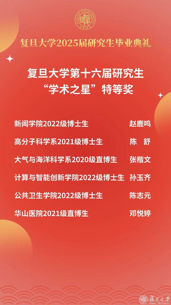 9年前,毕业生代表、计算与智能创新学院的孙玉齐从河南考入复旦,9年后,身着博士袍,他用建校120周年的“1”“2”“0”概括自己九年历程:一份初心让他锚定降低垂直领域AI大模型的研发成本的目标。 在导师颜波教授指导下,与团队创新利用合成数据,证明“小数据”也能培养“大模型”。科学研究与产业应用双轮驱动的路径,让他“从产业难题中挖掘科学问题,用科研成果赋能产业发展”,为实现“工科问题理科化,理科成果工科化”而努力。与团队开发AI肖像重建系统,既用于公安破案,更重建烈士遗像告慰亲属,实现科技与人文共鸣。而“从零开始”的勇气,让他迈出创业第一步,成立“复铼智能”(FlyAI),推动国产精密仪器智能化,获全国颠覆性技术创新大赛优胜奖,并得到复旦科创母基金关注,入选F-LAB科学家创业营。“创业路艰险,但复旦赋予的能力和勇气让我能笑对挑战,人生,区区三万天,试试又能怎。”