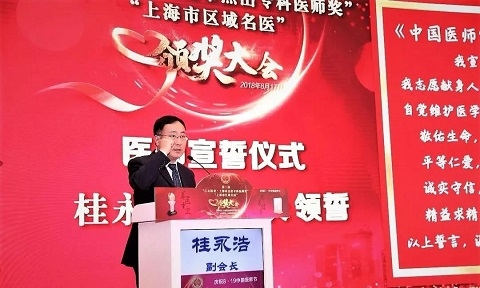 在第二届“仁心医者·上海市杰出专科医师奖”、“上海市区域名医” 颁奖大会上,上海市医师协会副会长、复旦大学常务副校长桂永浩带领全体参会医师庄严宣读《中国医师宣誓誓词》。