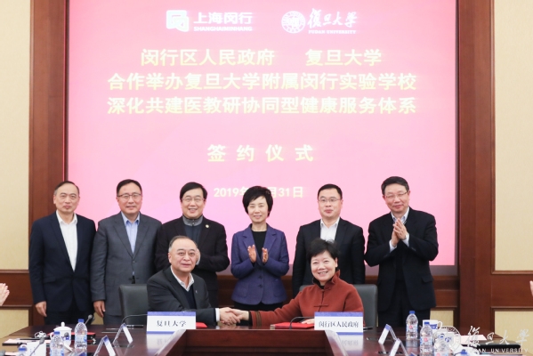 签约仪式由复旦大学党委副书记、上海医学院党委书记袁正宏主持。会上,复旦大学常务副校长、上海医学院院长桂永浩,副校长张人禾分别与闵行区副区长杨德妹签署《深化医教研协同型健康服务体系共同建设协议》《合作举办复旦大学附属闵行实验学校协议》。闵行区委副书记、组织部部长王观宝,复旦大学副校长张人禾,复旦大学上海医学院副院长汪志明,以及区校相关职能部门负责同志参加签约活动。