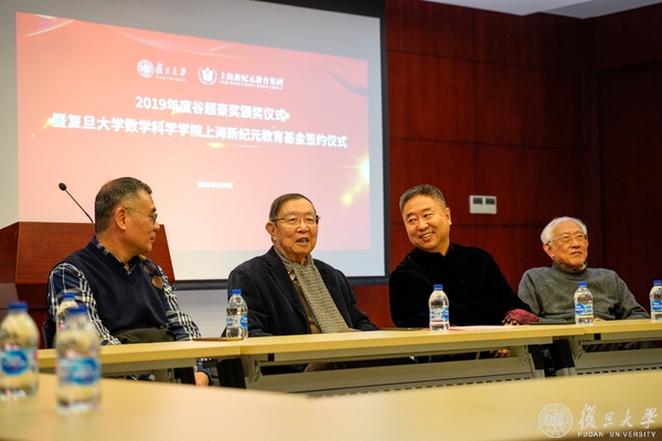 签约仪式后,双方举行交流座谈会,李大潜、洪家兴、陈恕行分享了求学为师的感悟,陈猛、雷震分别发表获奖感言,表示将继续传承和弘扬谷超豪先生等老一辈数学家的精神,不忘初心、牢记使命,围绕立德树人根本任务,认真履行潜心科研、教书育人的职责,为祖国的教育事业不断添砖加瓦,争取在新时代“双一流”建设中取得更大的成绩。
