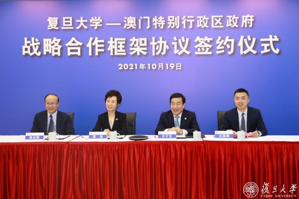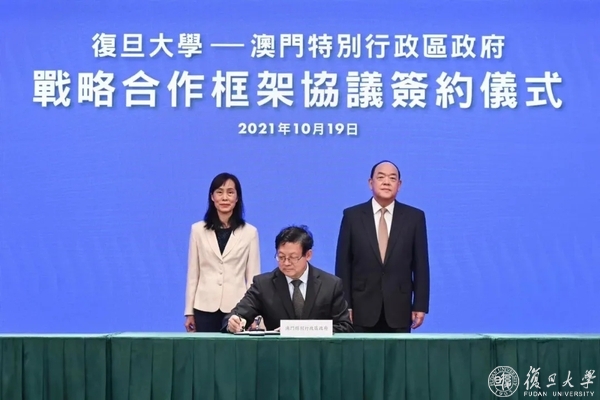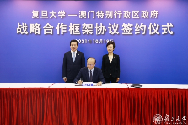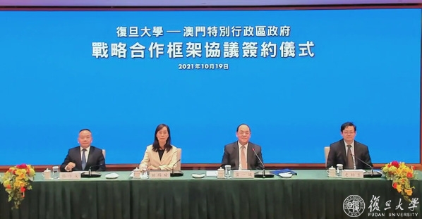 10月19日下午,复旦大学与澳门特别行政区政府签订战略合作框架协议,进一步深化和推进复旦大学与澳门特别行政区的交流合作,助力粤港澳大湾区创新高地建设。