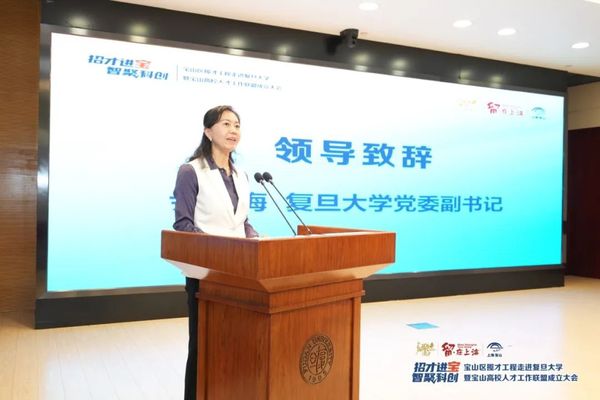校党委副书记尹冬梅在大会致辞中欢迎宝山领导到访复旦,并感谢宝山区委区政府为复旦毕业生提供良好的发展平台和工作岗位。尹冬梅表示,复旦作为宝山高校人才工作联盟的首批21所高校之一,将主动承担大学的社会责任和使命,落实好总书记关于新时代人才工作的新理念、新战略、新举措,为宝山的发展,持续不断地输送德才兼备的人才。