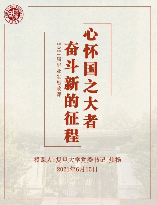 从2017年“做无愧于时代的复旦人”,到2018年“不忘初心,励志力行,做好新时代的答卷人”,到2019年“为国奋斗,永远奋斗”,再到2021年“心怀国之大者,奋斗新的征程”,6月15日,是焦扬第四次走上讲台,为毕业生们带来“最后一堂思政课”。现场毕业生们有掌声,有泪光;下课铃声响起时,掌声雷动。