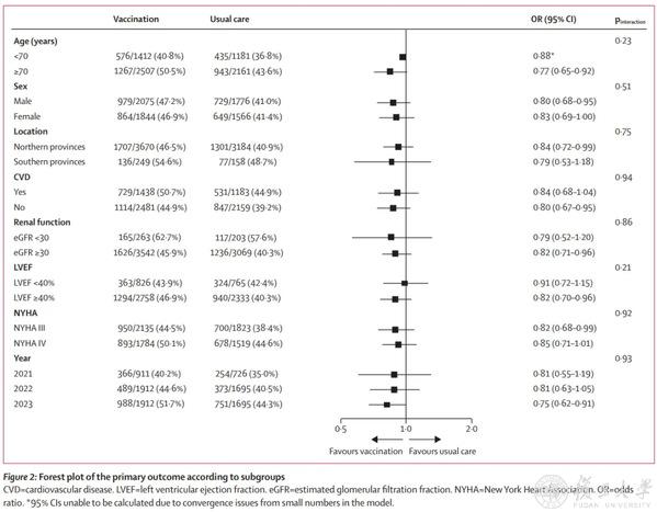 随访结束后,核心数据浮出水面:疫苗接种组患者的复合终点(全因死亡 + 全因再入院)发生率 41.2%(1387例),常规护理组 47.0%(1843例),绝对风险降低5.8%(OR 0.83, 95%CI 0.72-0.97; P=0.019)。