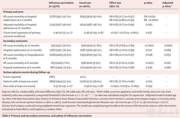 以医院作为整体进行分析,疫苗接种组主要终点发生率比常规护理组低3.7%,这意味着每接种27个患者,就能减少一个“死亡或再入院”事件。与常见心血管预防药物相比——例如通常需让近1000人服用阿司匹林才能预防1例心梗——流感疫苗的健康获益显得尤为高效。