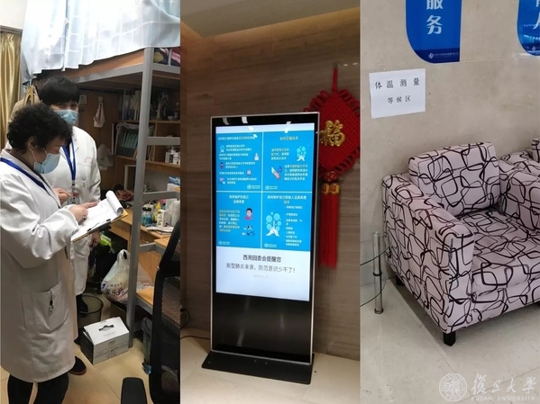 校医院是校内疫情筛查的第一线,也是此次防控指挥部的所在。邯郸校医院和枫林门诊部每日值班,做好发热病人筛查关口前移,并会同各单位建立疫情重点防控期间的师生员工健康异常情况自主申报制度。