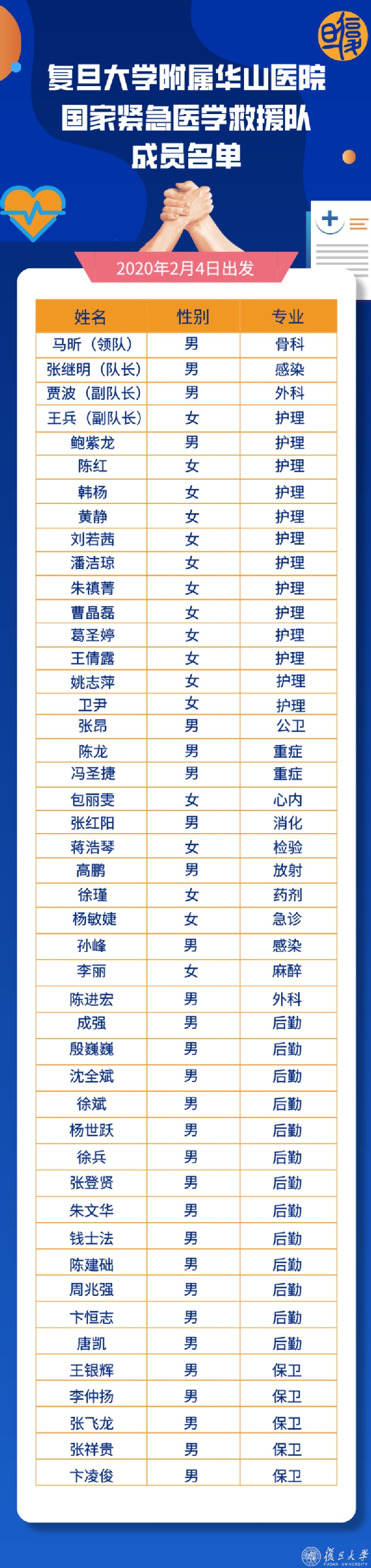 2月4日,立春。带着全体复旦人、华山人的支持、鼓励与祝福,一支由46位救援队员、6辆移动救援车组成的复旦大学附属华山医院赴鄂国家紧急医学救援队从华山大道开拔,驰援武汉抗疫战斗第一线!