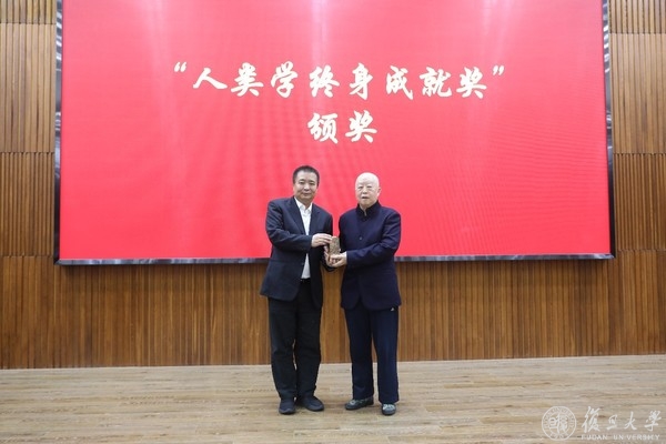 当天下午,上海人类学学会召开了“元世界人类学”为主题的2021学术年会。按照传统,年会颁发了今年的人类学终身成就奖,以褒奖在人类学的各个领域奋斗终生、取得卓越贡献和深远影响的著名年长学者。颁奖典礼上,金力将人类学终身成就奖的“金琮”奖杯颁发给了广西民族大学退休教授徐杰舜。他从1979年就开始从事人类学研究,历经数十年,完成的九卷本《汉民族史记》和六卷本《中华民族史记》被认为是人类学研究不可绕过的学术作品。
