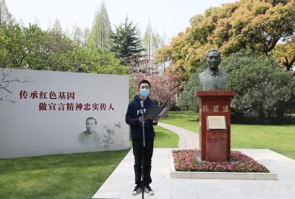 2020年是复旦大学老校长陈望道翻译出版《共产党宣言》首个中文全译本100周年。4月3日上午的复旦校园春意盎然,邯郸校区陈望道塑像旁,新叶吐绿,鸟语花香。复旦师生通过线上线下相结合的方式,举行“传承红色基因,做宣言精神传人”追思纪念活动,缅怀老校长陈望道等复旦先贤先烈,重温“宣言精神”,纪念老校长翻译《共产党宣言》首个中文全译本100周年,启动“红色基因铸魂育人工程”。