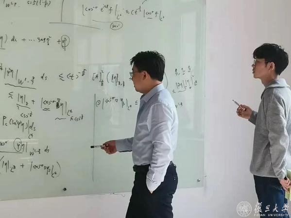 雷震教授与同学驻足白板前,不断演算,研讨授课。