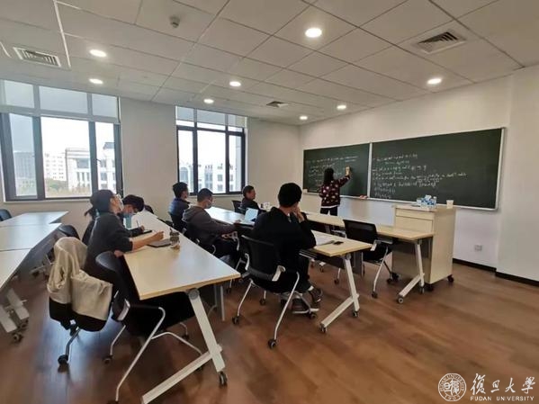 次日清晨,校区内教学科研工作平稳有序开展,一白板的演算搭配窗外平静的湖面。数学科学学院、上海数学中心教授吴泉水正在为同学上小班课。