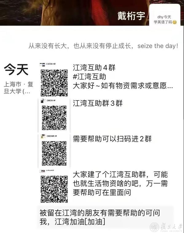 同舟共济——在学生自发建立的4个“江湾互助群”内,大家彼此答疑解惑,施以物资援助,力所能及。