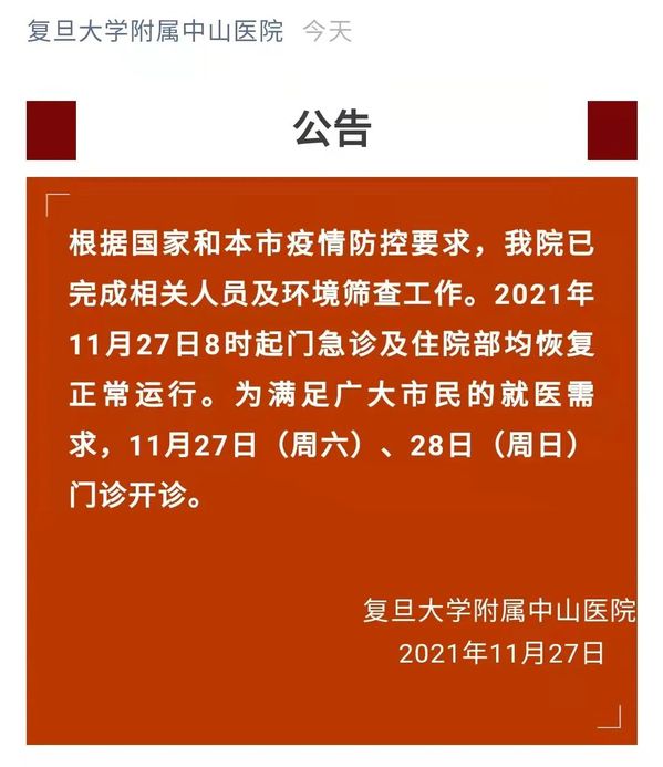 为满足患者医疗需求,中山医院将线下就诊功能平移至线上互联网医院,普通门诊医生仍然按照原先排班正常出诊。自11月26日起,所有线下共39个科室的普通门诊皆可在线上完成诊疗服务,仅当天共1000余人完成了互联网医院网上门诊挂号。结束闭环管理,中山医院门诊周末两天均开诊。