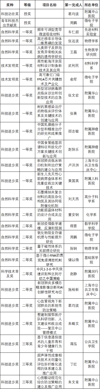 2020年度上海市科学技术奖复旦大学获奖名单