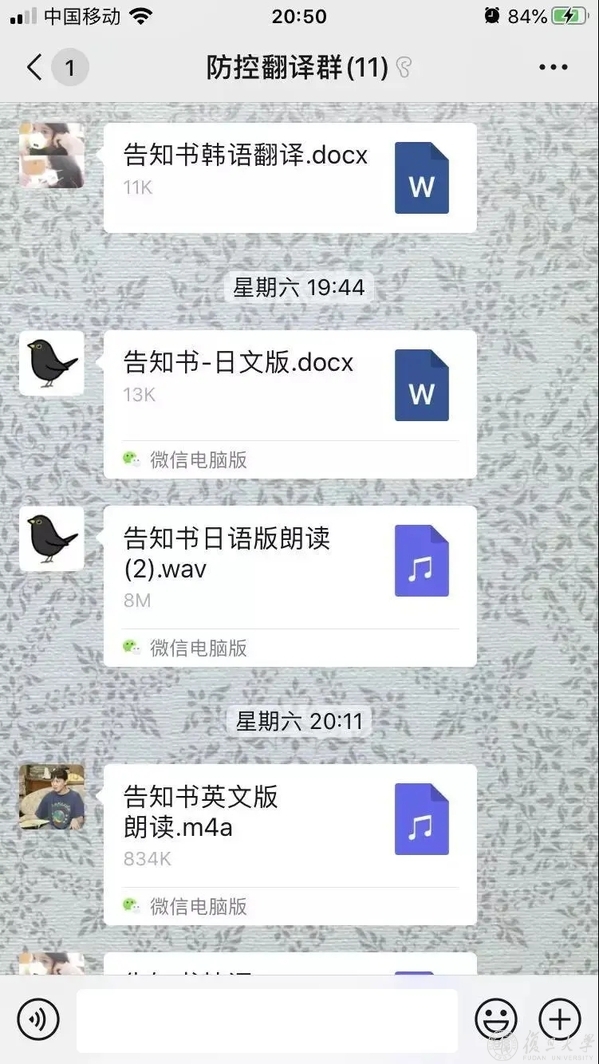 为助力社区防疫一线工作,一支由复旦大学外文学院学生组成的 “语•疫”线上多语翻译服务小队成立,对接社区、医院一线翻译需求。志愿者们发挥专业优势,将对医院问诊模板和社区走访问题清单翻译成多语种版本,制作《预诊预判多语口袋书》供多家医院、多个街道社区使用,为一线预诊预判提供便利。