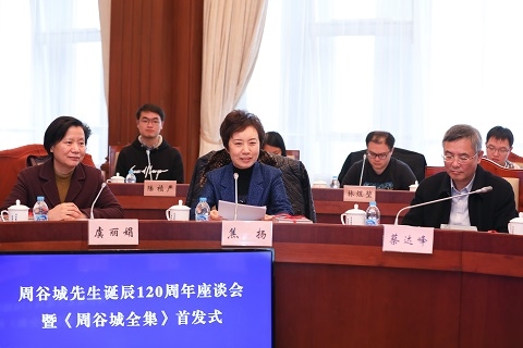 焦扬向《周谷城全集》的编纂出版表示热烈祝贺,向关心支持《全集》出版的各界人士表示衷心感谢。她说,周谷城先生一生治学育人、著作等身,追求光明和真理,始终与人民同呼吸、共命运,与中国共产党休戚与共、风雨同舟,他是爱国民主、追求进步的楷模,潜心学术、开拓创新的楷模,为人师表、诲人不倦的楷模,是让我们感到无比光荣和自豪的复旦人,他的学识与精神、人品和功业,值得我们称颂敬仰、继承发扬。在周谷城先生诞辰120周年之际对先生著作的全面结集出版,既是对周谷老的最好纪念和缅怀,也是一项具有重大意义的文化工程。她强调,学校要充分挖掘和利用《周谷城全集》这个宝藏,既进一步深入研究周谷老的学术思想,更要从周谷老的爱国情怀、治学精神和崇高师德中汲取营养,坚持立论创学、立德树人、立身强教,以改革开放再出发的姿态,在繁荣发展中国特色哲学社会科学上走在前列,在培养社会主义建设者和接班人上走在前列,在加快推进“双一流”建设上走在前列,为实现中华民族伟大复兴的中国梦作出新贡献。