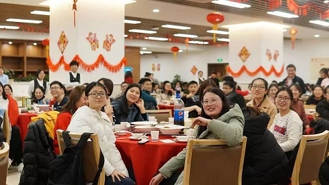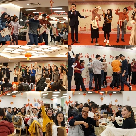 两场迎春会上,师生们不仅享受到了美味丰盛的年夜饭,还欣赏了阿卡贝拉人声合唱、古筝演奏、京剧、相声、魔术、武术、歌舞等精彩节目。参与表演的不仅有中外学生,还有老师和已经毕业的校友,以及来自学生生活园区的管理督导员。迎春会中穿插了“福旦知否”、“福聚复旦”、“猪年要团圆”等互动游戏,抽取了“如有神助”、“胸有成竹”、“字字珠玑”、“掌上明珠”等奖项,现场其乐融融,高潮迭起,师生共享了一场复旦版“春晚”。最后,迎春会在厨师和服务员登台,全场同唱“新年好”的歌声中落幕。
