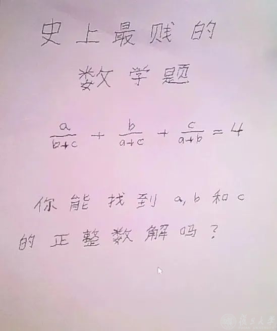 幻灯片下,出现的是查吉尔用中文写的,“史上最‘贱’的数学题,你能找到a,b和c的正整数解吗?”这是几年前在德国,一位与他讨论的中国数学家给他看的。“我的同事说,在中国互联网上,忽然出现了一个数论的问题,提到有95%的人解不出这道题,我觉得应该是99.999998%的人没有办法解决。”