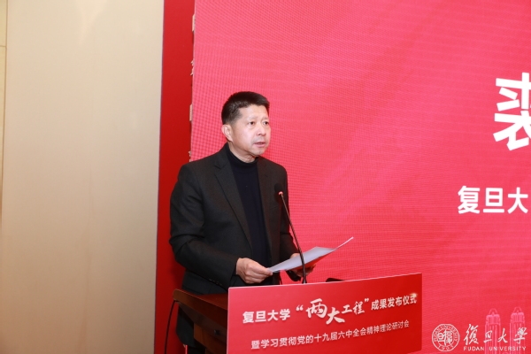 12月19日下午,“两大工程”一期成果20本著作在复旦大学“两大工程”成果发布仪式暨学习贯彻党的十九届六中全会精神理论研讨会上正式揭幕。上海市委常委、宣传部部长周慧琳,复旦大学党委书记焦扬,上海世纪出版集团党委书记、董事长黄强在“两大工程”成果发布会上致辞。复旦大学党委常务副书记裘新主持。