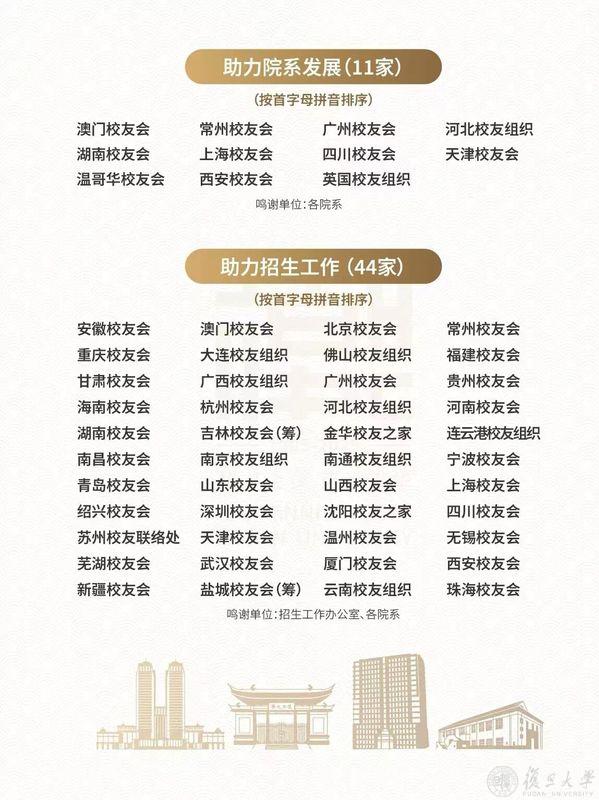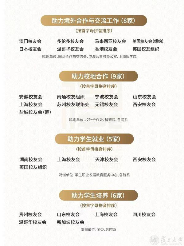 校友总会副会长和母校各院系、部处老师为7批共159个次地方校友组织颁发鸣谢奖杯;并感谢海内外76家校友组织积极联络校友参与校友年度捐赠与“复旦源”公募;金力为珠海校友会和上海校友会颁发特别鸣谢奖杯,特别鸣谢这两个地方校友会为母校百廿华诞所作的重要贡献。