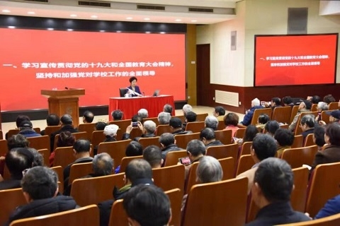 焦扬首先代表校党委和全校师生,向始终关心和支持学校改革发展的老领导、老干部、老教授、老同志,向全校离退休工作者,表示衷心的感谢和崇高的敬意。她从学习宣传贯彻党的十九大和全国教育大会精神,坚持和加强党对学校工作的全面领导;加强党建和思政工作,启动“三全育人”综合改革试点;坚持改革攻坚,坚定不移把学校全面深化改革引向深入;加快“双一流”建设,推动学校各项事业发展开创新局面等四个方面详细回顾了2018年学校主要工作和各领域的新成绩新进展,并介绍了2019年学校工作的总体要求,通报了拟重点推进的六项工作任务。
