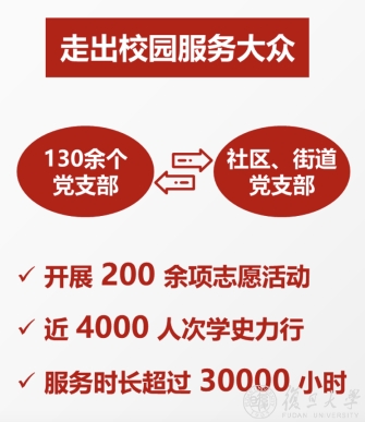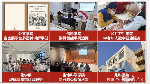 化学系、信息科学与工程学院、生命科学学院等院系组织党员深入街道社区开展科普辅导、智慧助老服务和疫苗接种宣讲;公共卫生学院师生开展中老年人数字健康服务的研究与实践;儿科医院为异地就医贫困儿童家庭打造“小布家园”,一年来已提供超4000个房晚的免费住宿……